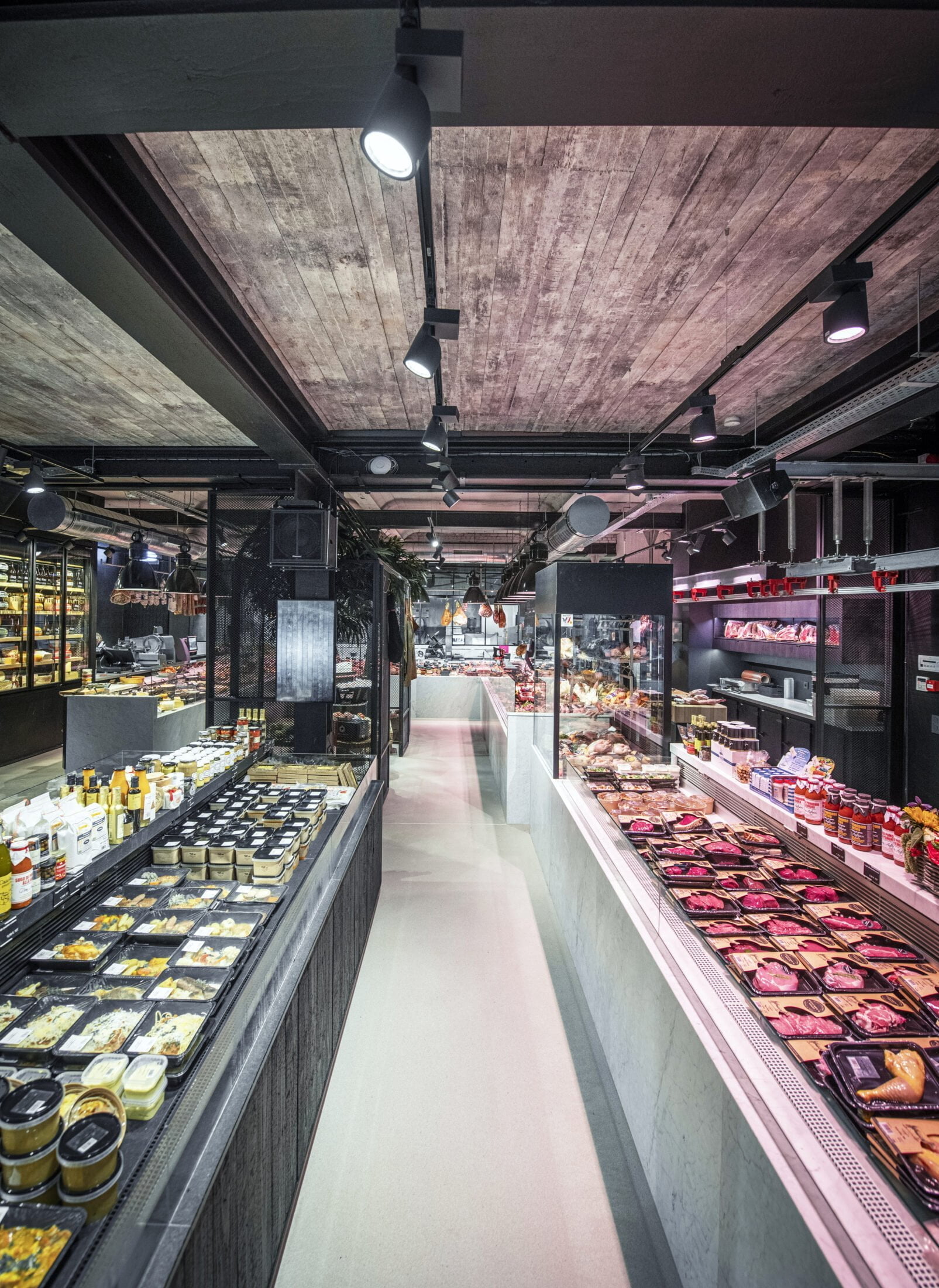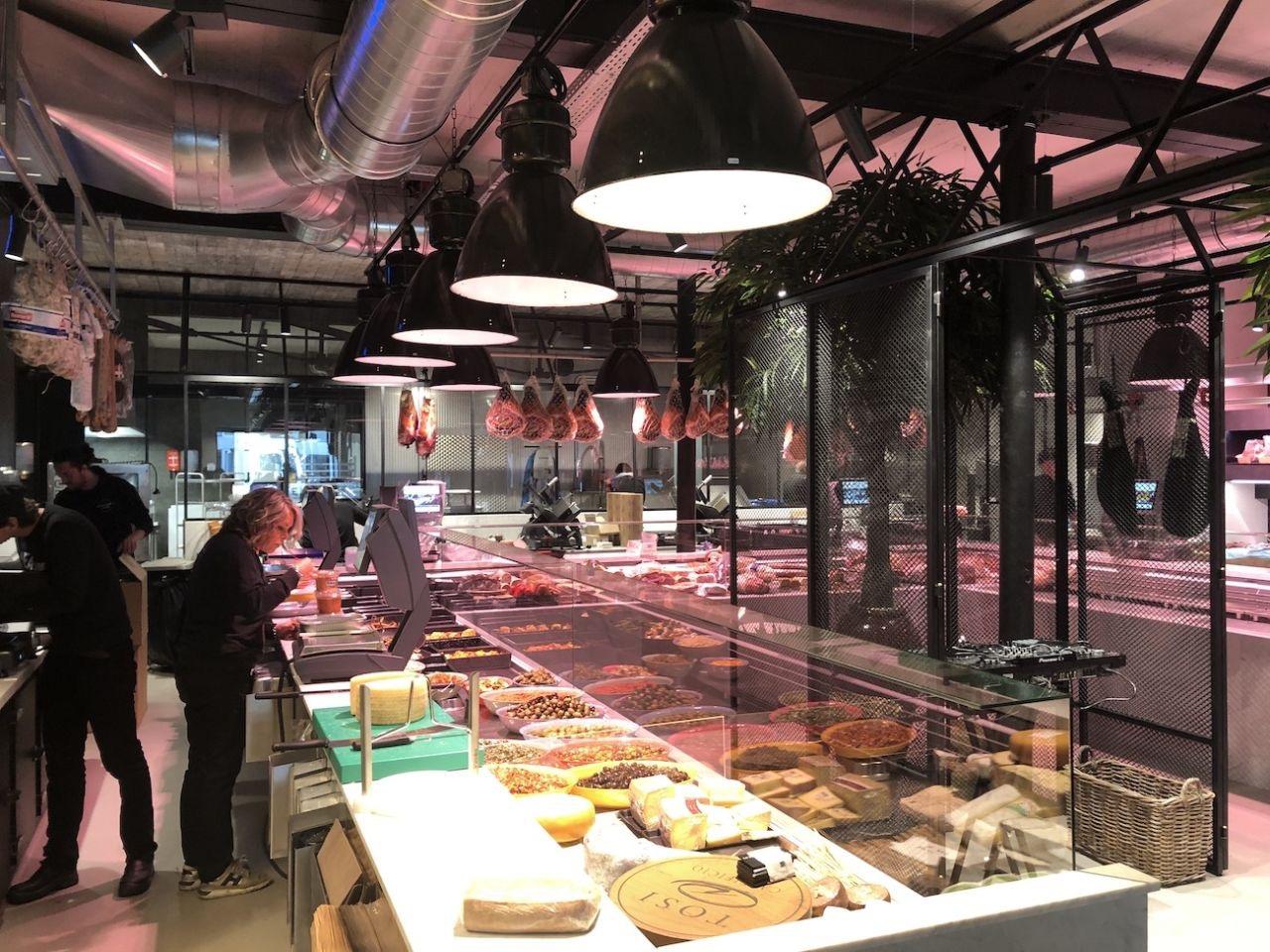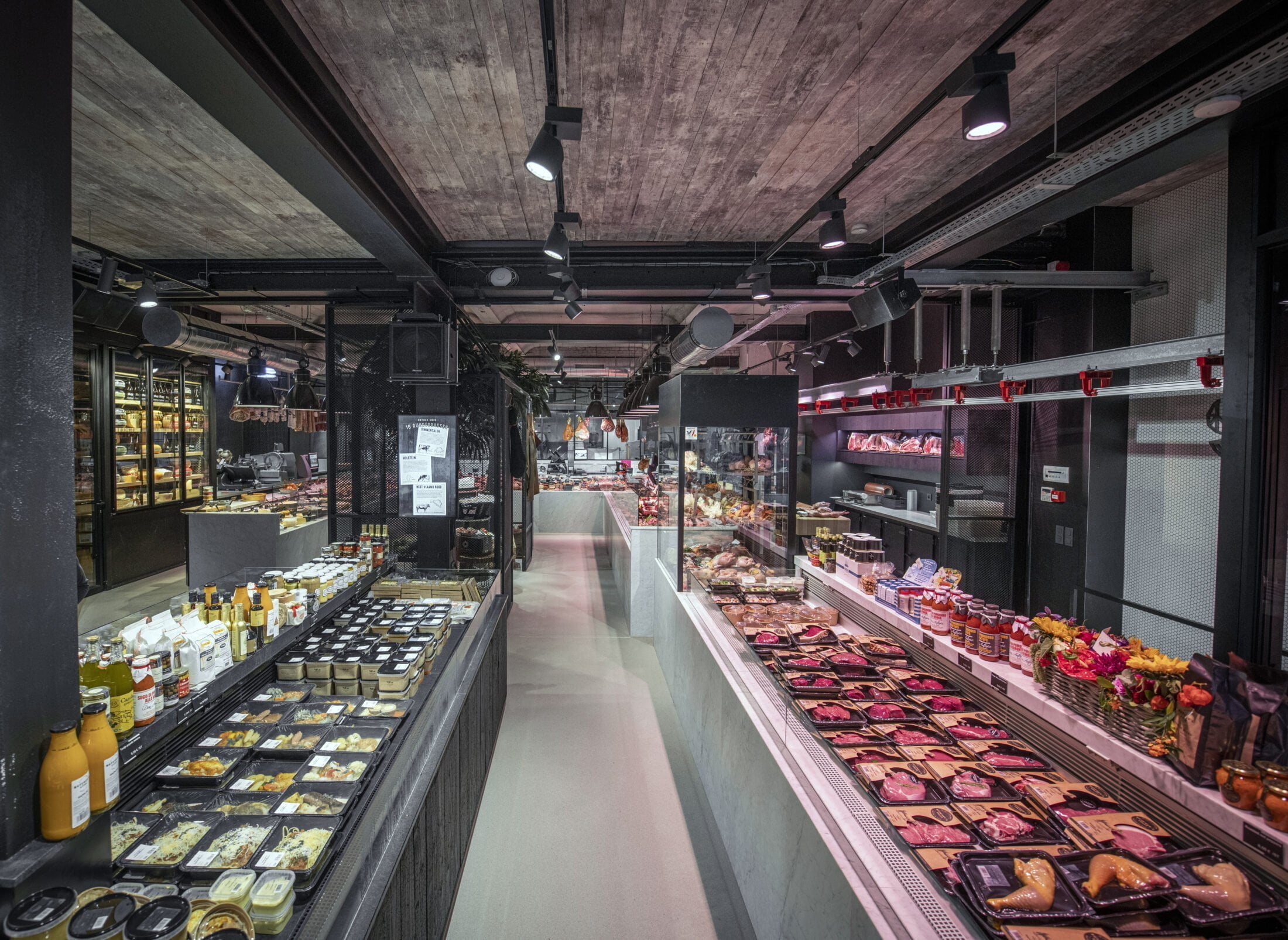 Wie können wir das Handwerk von Butcher’s Store Antwerp City South in der Einrichtung und Beleuchtung des Standorts widerspiegeln? Darüber hinaus haben wir alle Frischprodukte (Fleisch, Käse, Obst und Gemüse) und zubereitete Produkte auf unterschiedliche Art und Weise hervorgehoben.
