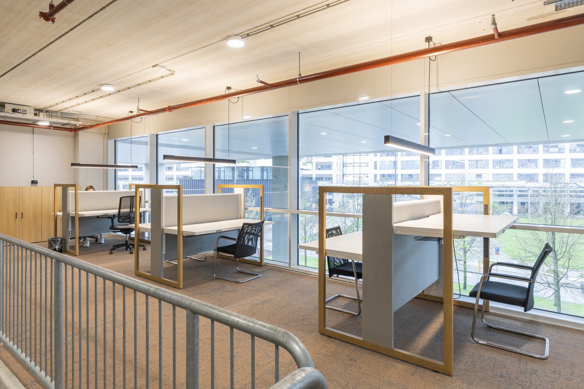 L’éclairage au-dessus des postes de travail doit être équilibré. Une lumière suffisante sur la surface de travail, sans ombre ni reflet. Ligne directrice : 500 lux horizontalement, 300 lux verticalement sur les murs, avec UGR ≤ 19. Les luminaires avec une distribution lumineuse asymétrique maintiennent l’image calme, même avec plusieurs écrans.