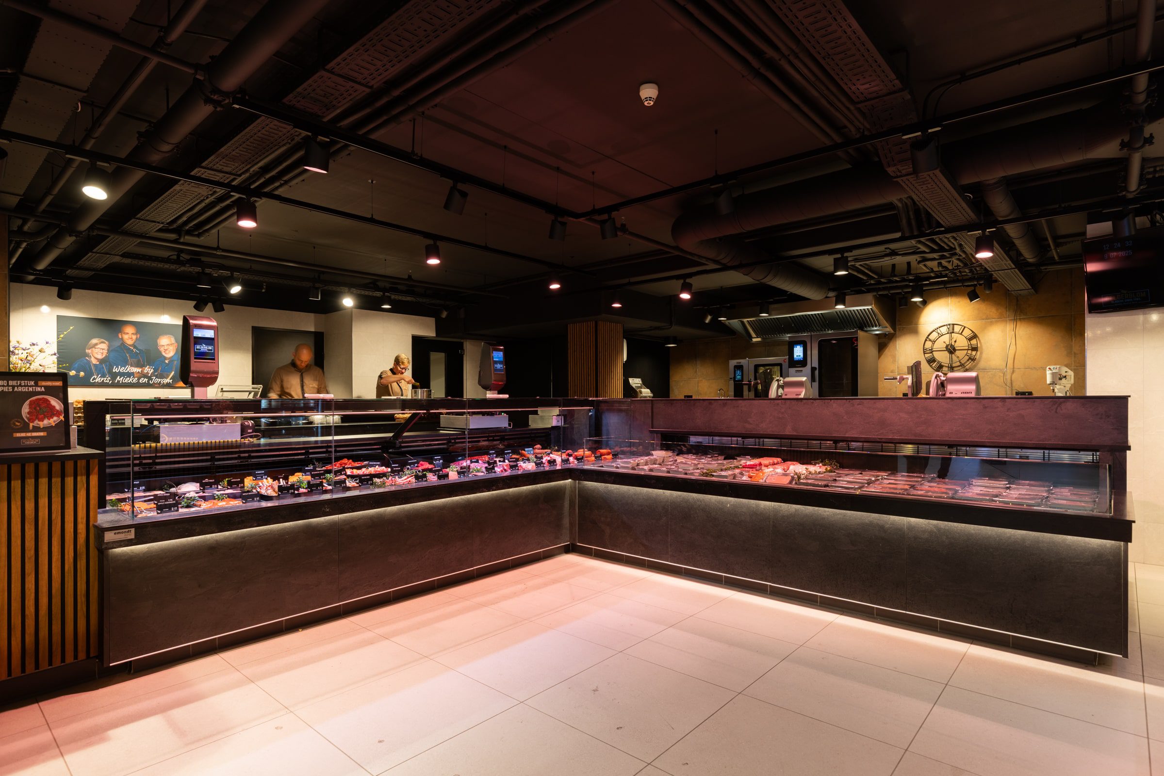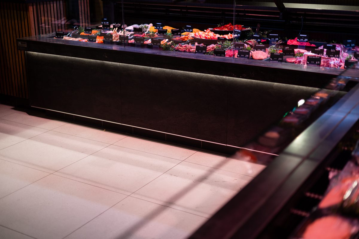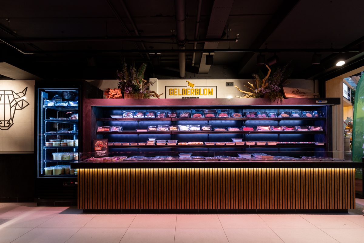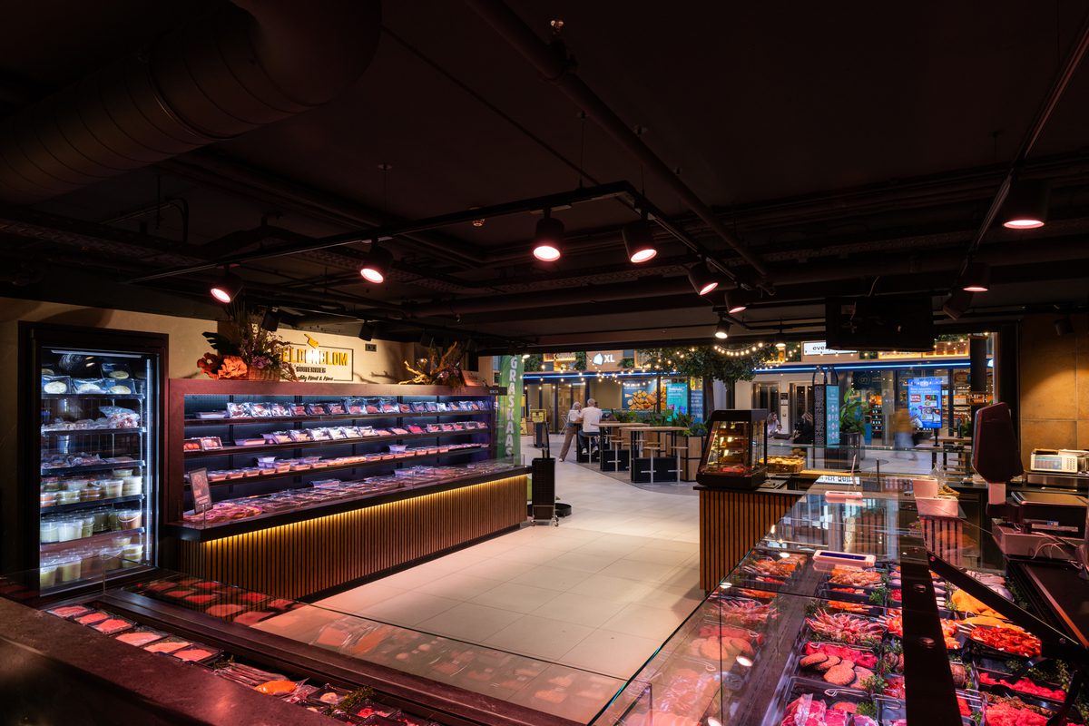 Sur la nouvelle place des produits frais du centre commercial Vier Meren, Gelderblom Slagerij Hoofddorp dispose de tout l’espace nécessaire pour montrer son savoir-faire. Mandatés par Emondt KMI, nous avons conçu et fourni l’éclairage, adapté à l’agencement ouvert avec un coin sandwich, un comptoir libre-service, un grand comptoir réfrigéré et un atelier visible.