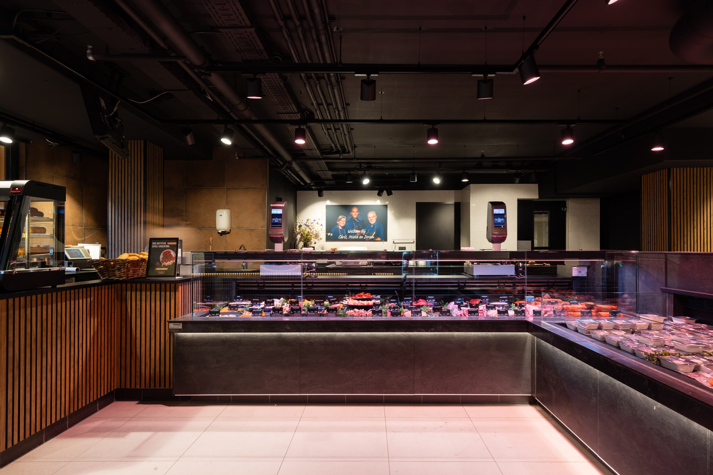 Au-dessus des vitrines, la couleur claire MEAT+ assure une présentation puissante et savoureuse de la viande chez Gelderblom Slagerij Hoofddorp. Les rouges riches, la viande hachée fraîche et les steaks magnifiquement marbrés apparaissent pleins et naturels, sans être déformés. Pour l’éclairage général, nous avons opté pour une lumière blanche chaude, qui donne à l’ensemble de la boucherie une lueur accueillante et éclaire l’acheminement vers le comptoir et le coin sandwich. Cette combinaison crée une base calme avec des accents forts aux bons endroits.