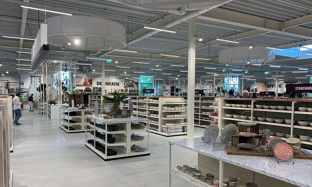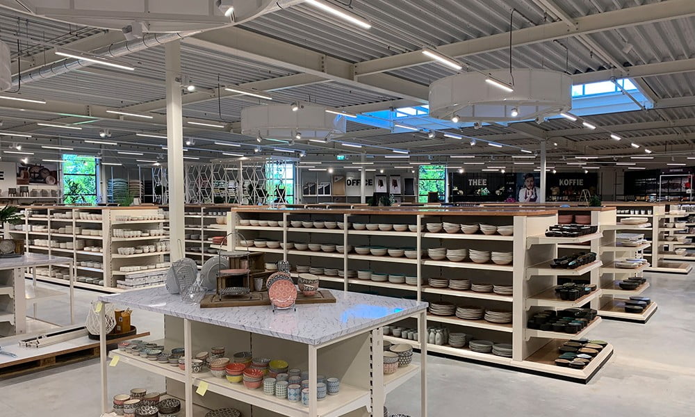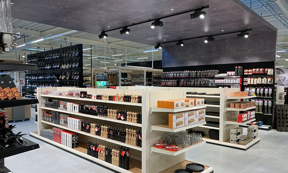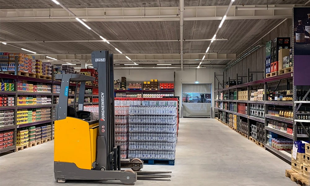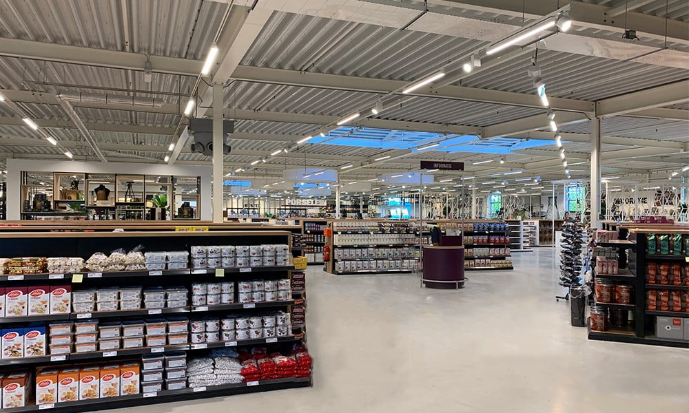 Un projet avec différents départements et produits, chacun éclairé au mieux. Des produits de qualité qui attirent l’attention dans les rayons et un environnement de travail sûr grâce à l’éclairage de l’entrepôt.
