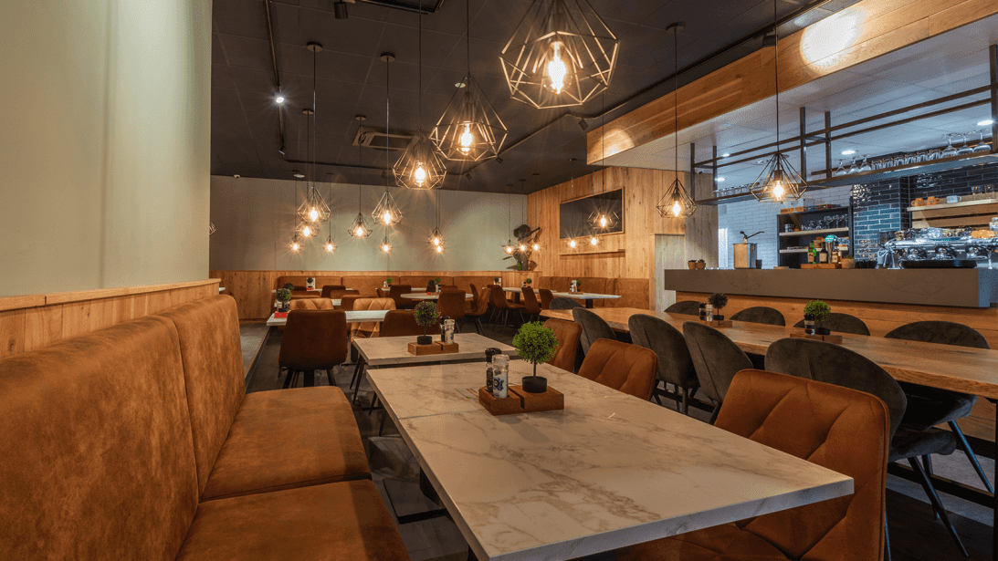 Un rail triphasé noir avec des projecteurs directionnels court le long du plafond. Ceux-ci fournissent un éclairage directionnel au-dessus du comptoir et des vitrines et assurent une visibilité adéquate sur les produits, les écrans de commande et les surfaces de travail. Le tout sans compromis sur l’apparence. L’éclairage du kiosque de libre-service a également été judicieusement placé, suffisamment lumineux pour faciliter l’utilisation, mais discret pour ne pas dominer l’entrée.