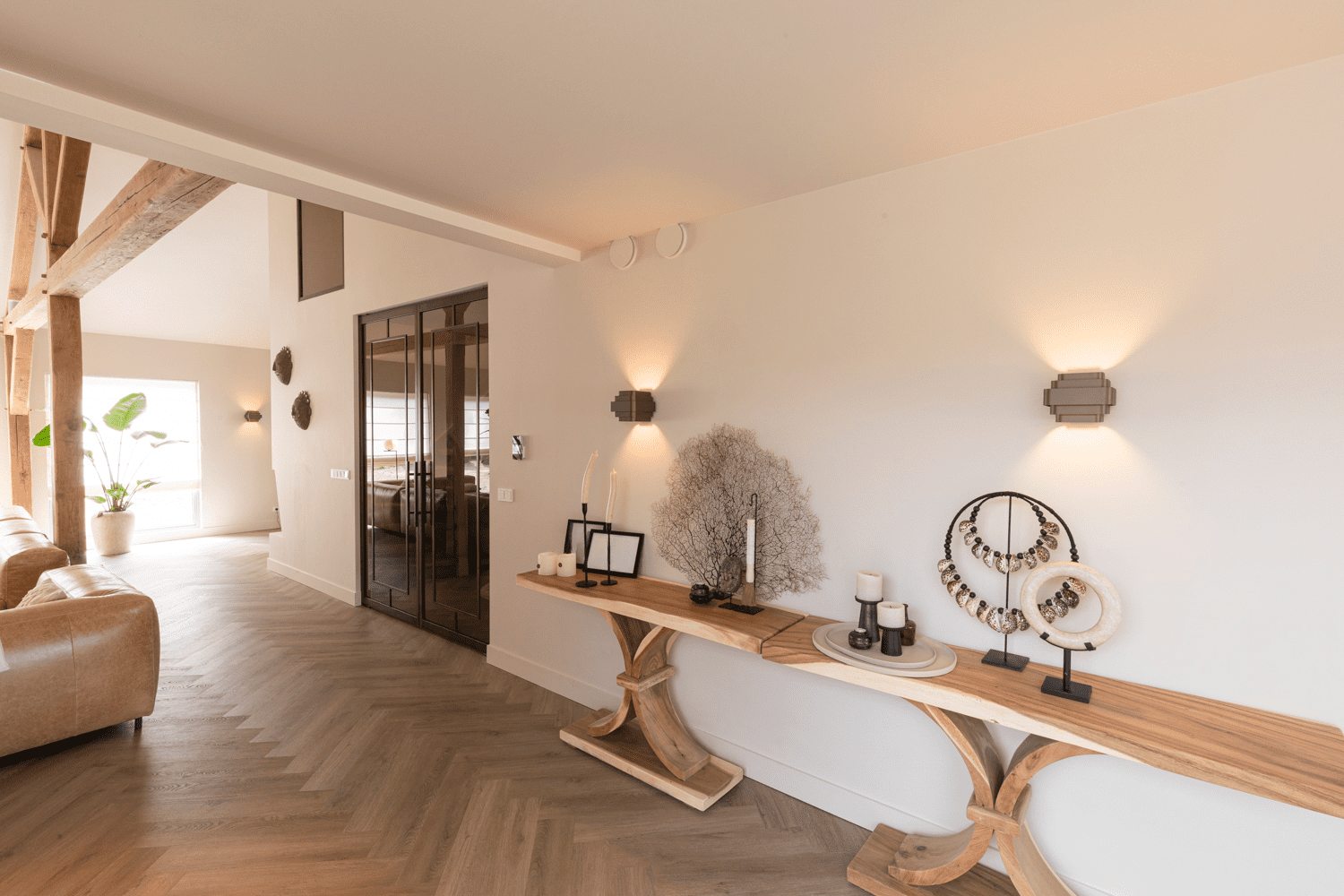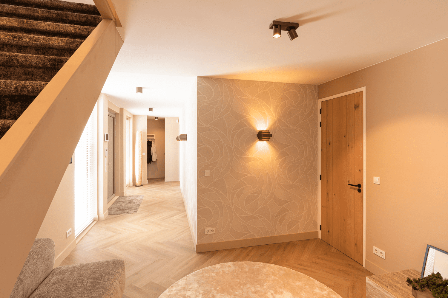 Une attention particulière a également été portée à l « éclairage des couloirs et du hall d’entrée, où des spots stratégiquement placés créent un magnifique jeu de lumière, à la fois fonctionnel et accueillant. L » éclairage indirect le long des murs crée une atmosphère agréable et transforme ces espaces habituellement fonctionnels en une extension de l’intérieur.