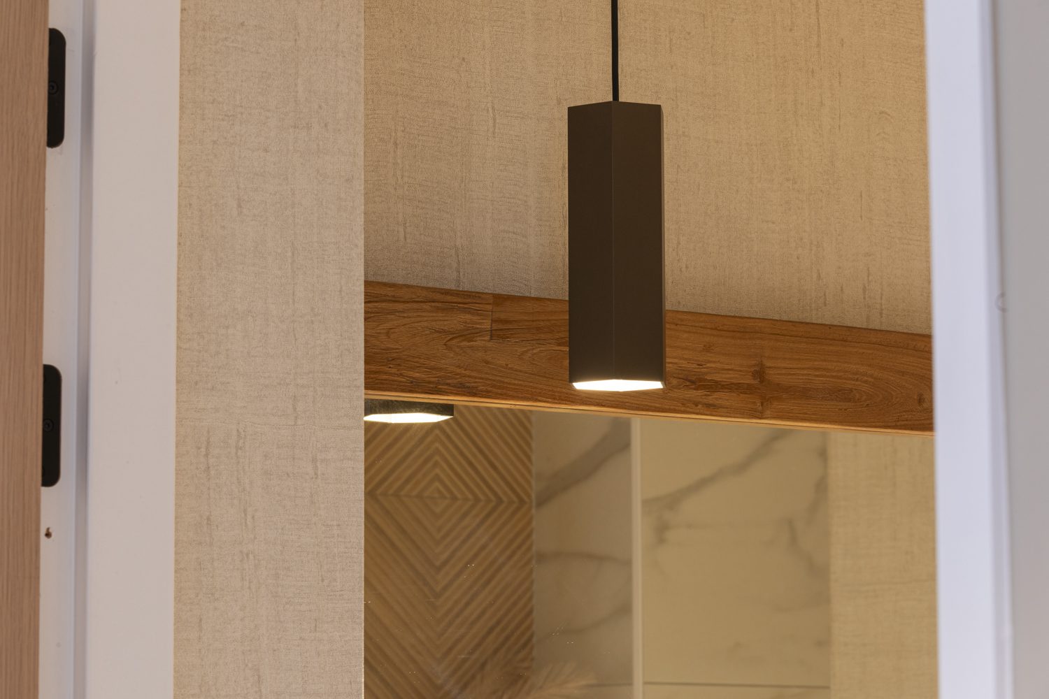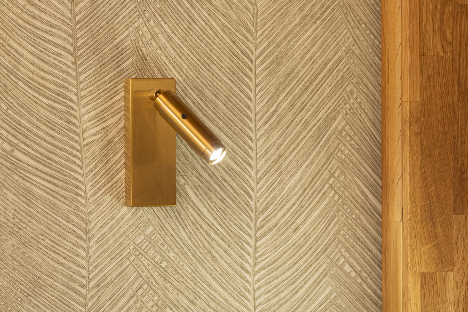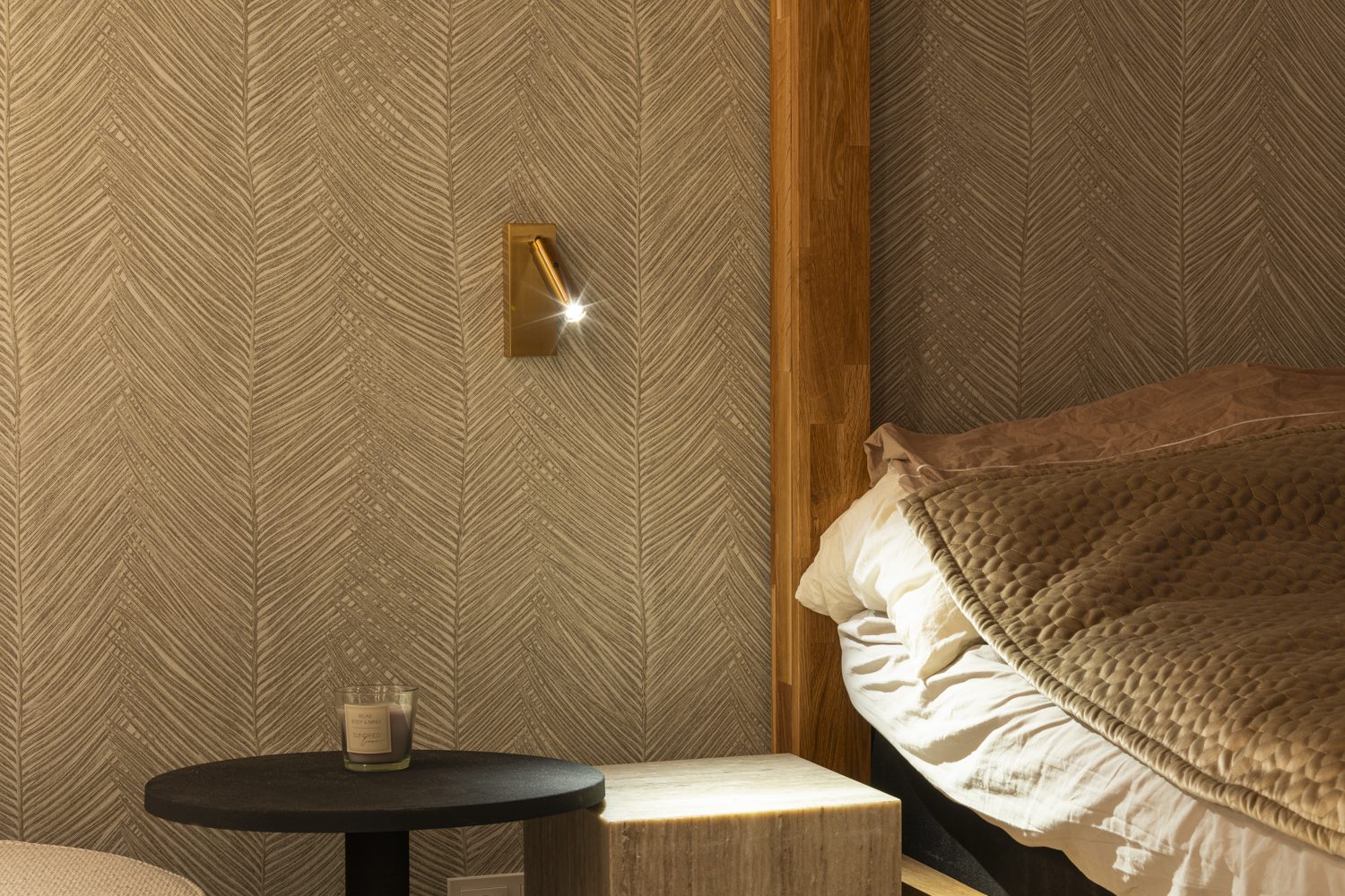 Dans la chambre à coucher, nous avons choisi des appliques murales qui créent non seulement une atmosphère chaleureuse, mais qui ont également une fonction décorative. Les lampes mettent en valeur les éléments en bois de l’intérieur, créant ainsi une ambiance naturelle et apaisante.