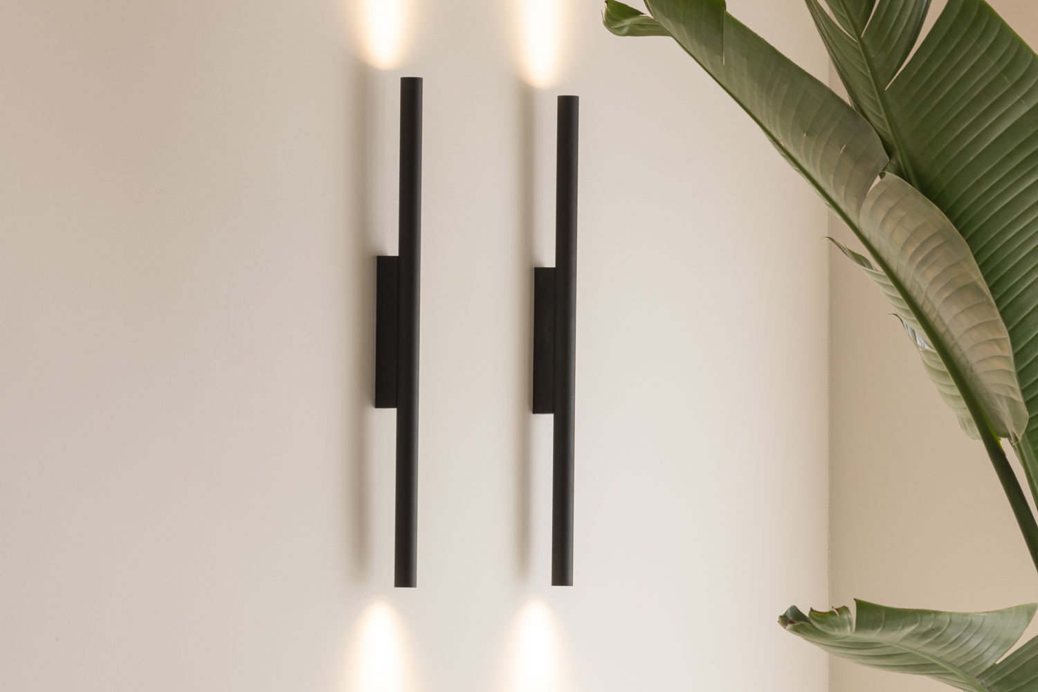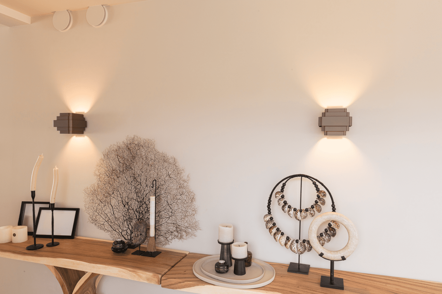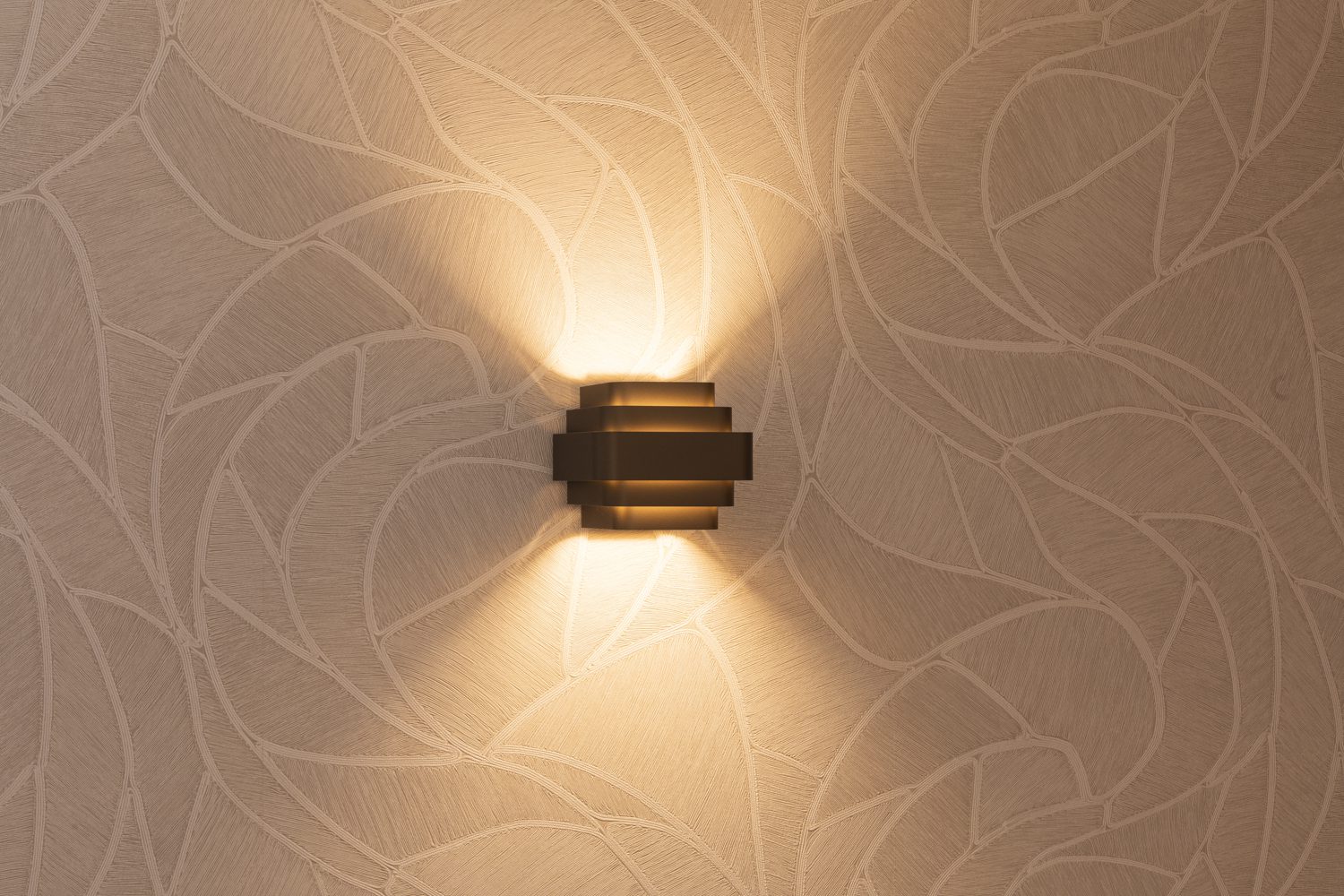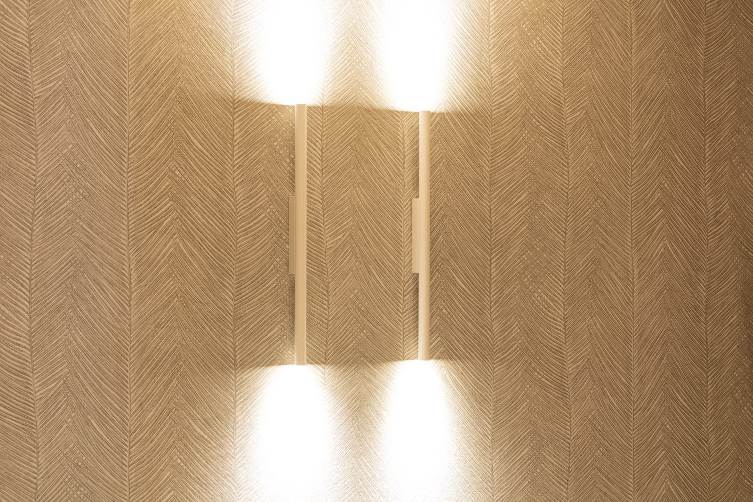 Dans la chambre à coucher, nous avons choisi des appliques murales qui créent non seulement une atmosphère chaleureuse, mais qui ont également une fonction décorative. Les lampes mettent en valeur les éléments en bois de l’intérieur, créant ainsi une ambiance naturelle et apaisante.