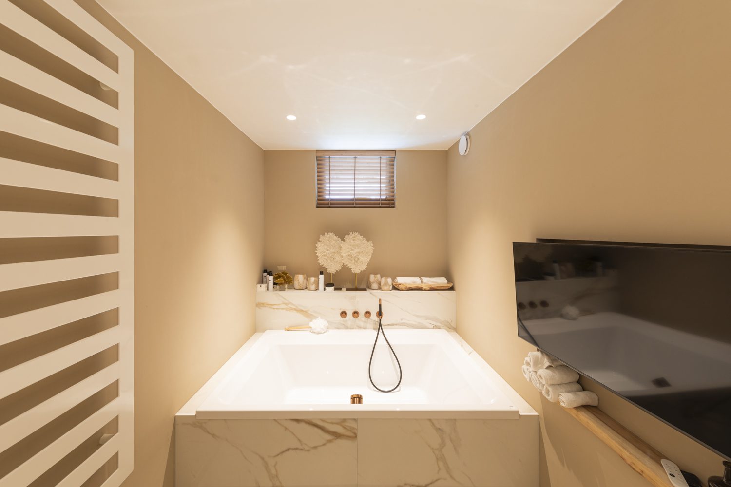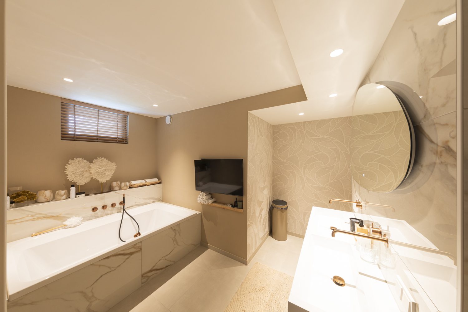 La salle de bains est luxueuse grâce à l’utilisation de spots encastrés subtils qui éclairent la pièce sans la dominer. Cela crée une atmosphère sereine et relaxante, idéale pour les moments de tranquillité.