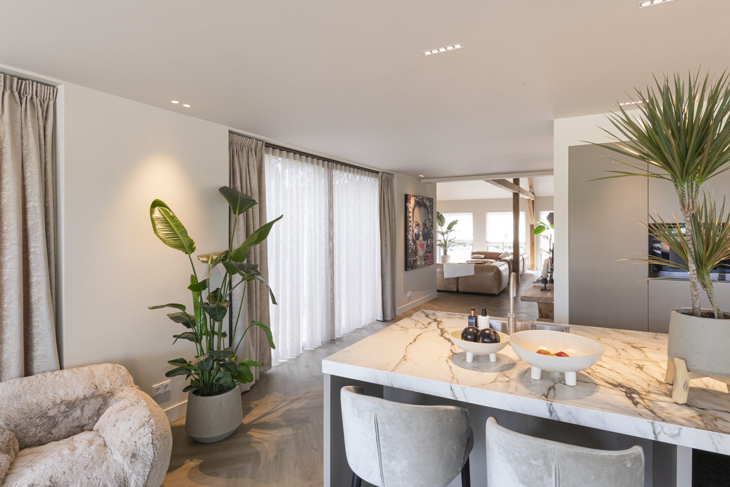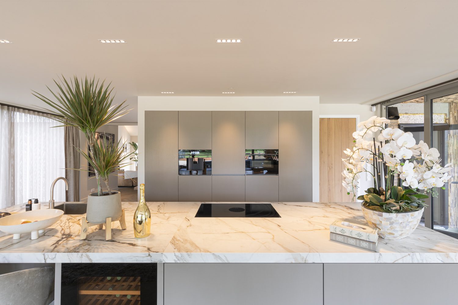 La cuisine dispose d’un éclairage fonctionnel sous la forme de spots intégrés au plafond. Ceux-ci fournissent un bon éclairage pour les activités quotidiennes, tandis que le design complète parfaitement l’aspect moderne des meubles de cuisine et du plan de travail en marbre.