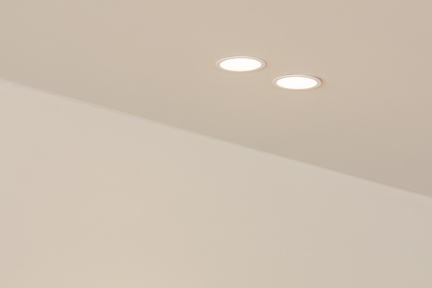 Dans le salon et la salle à manger, nous avons travaillé avec des spots encastrés dans le plafond. Ceux-ci fournissent un éclairage général clair mais subtil, parfaitement adapté aux différentes activités qui se déroulent dans cet espace ouvert. En outre, ces spots encastrés garantissent un éblouissement minimal et une image lumineuse confortable. En outre, une grande lampe suspendue d’ambiance a été placée au-dessus de la table à manger, contribuant à l’atmosphère intime pendant les dîners.