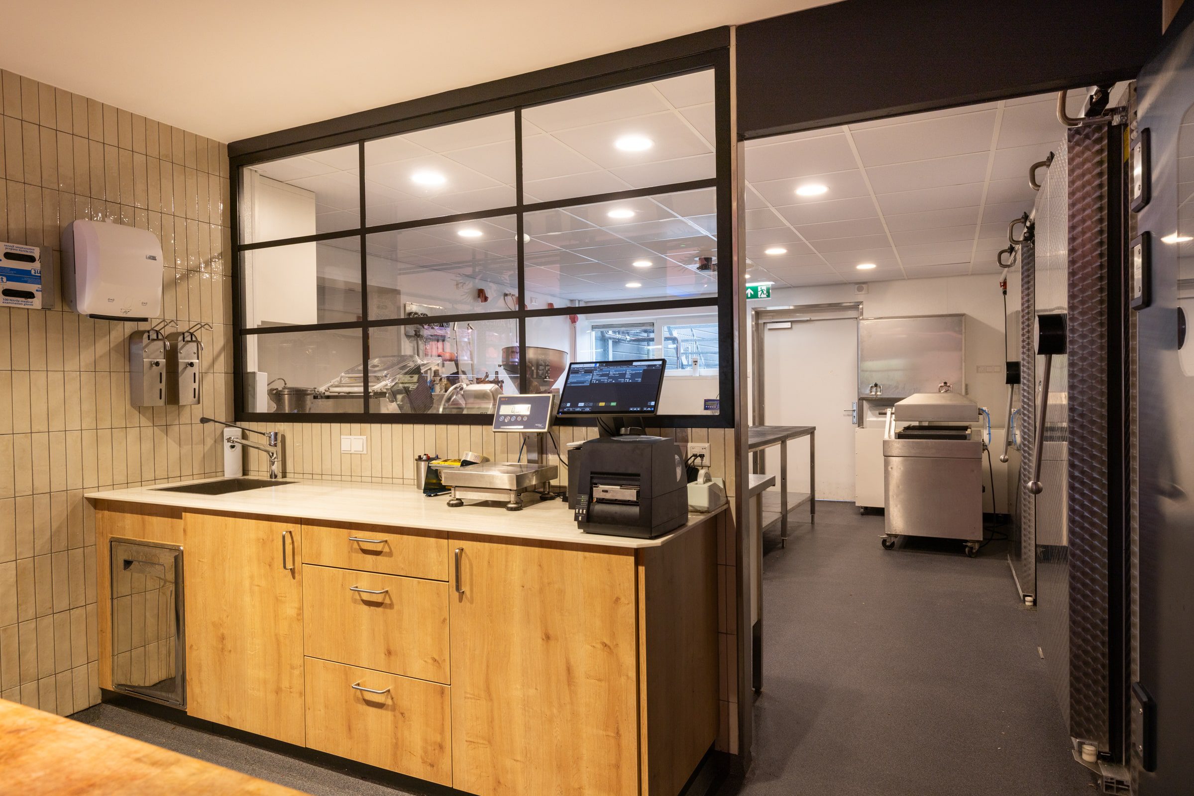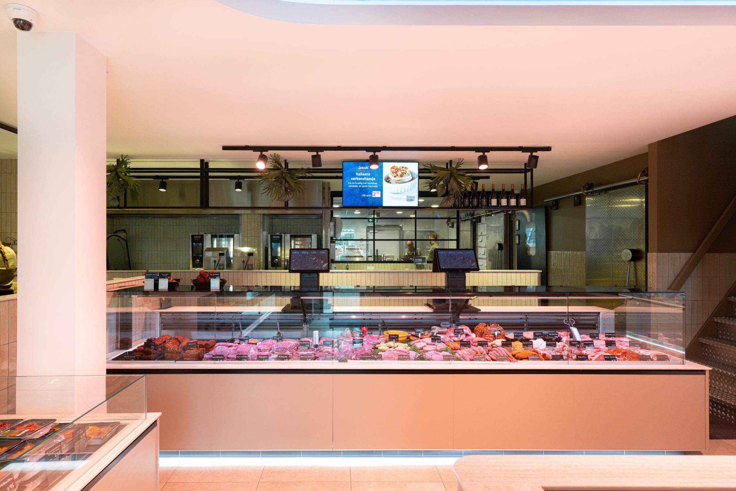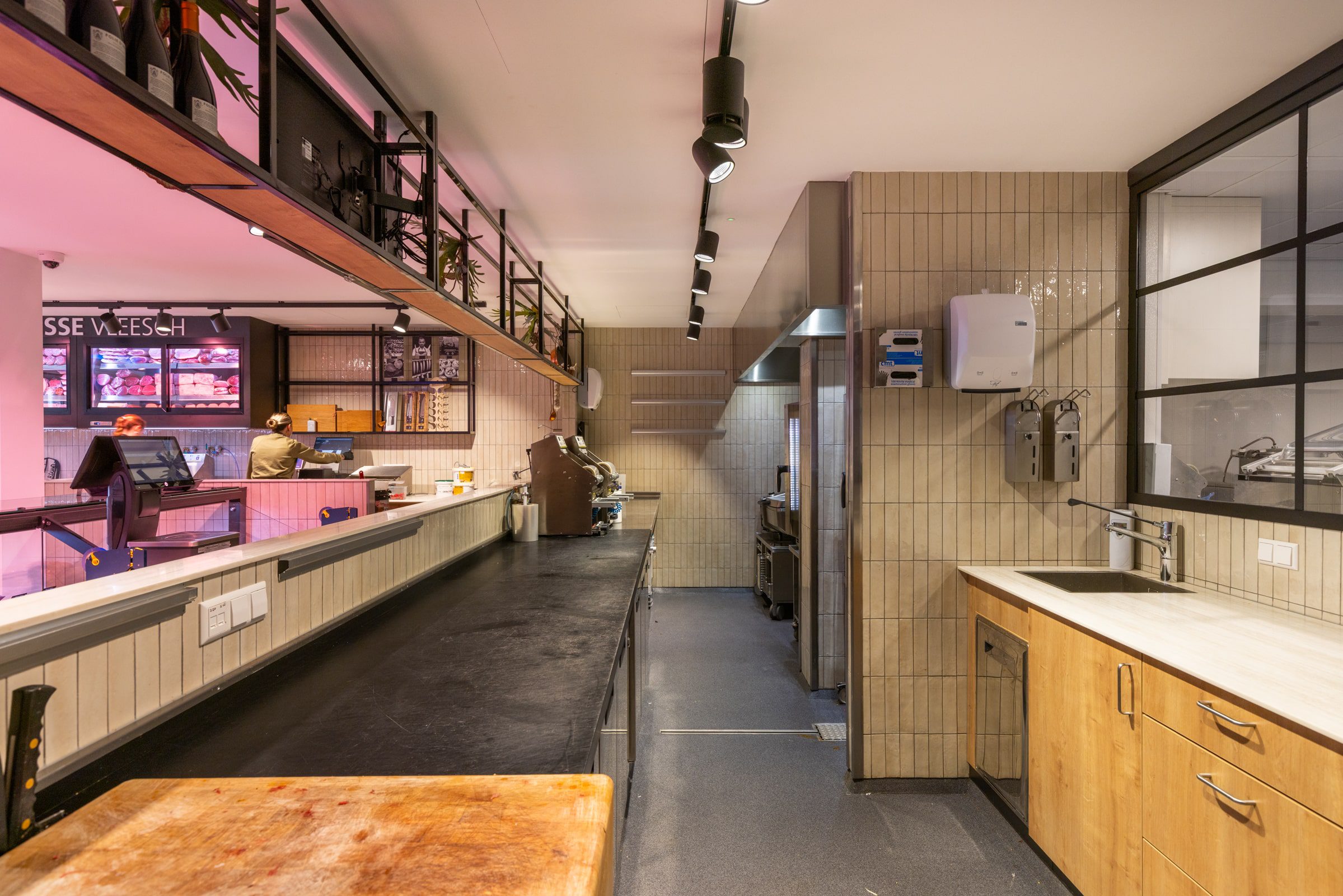 Wat deze slagerij extra bijzonder maakt? De open werkruimte. Klanten kijken zo de werkplaats in, waar het ambacht zichtbaar wordt gemaakt. Het juiste licht zorgt hier voor helderheid en hygiëne, terwijl het tegelijk het warme karakter van de winkel bewaart.
